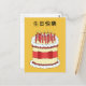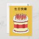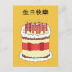 A large pastel coloured birthday cake with several lit candles on top, against a golden coloured background. The image has 'Happy Birthday' in Cantonese written above the cake.
