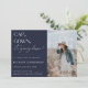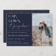 CAP, GOWN, it's going down! Contemporary graduation party photo invitation. Modern typography design on navy blue backgrounds with faux silver geometric pattern backing.