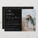 CAP, GOWN, it's going down! Contemporary graduation party photo invitation. Modern typography design on black colour backgrounds with faux gold geometric pattern backing.