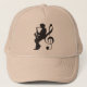 A cap with the silhouette of a saxophone player en profile with his back against a G-key. A jazzy design. Jazz it up!!