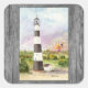 The distinctive black-and-white banded Cape Canaveral lighthouse in Florida is depicted in this watercolor painting by JC Prida. In the background, a rocket takes off from nearby Kennedy Space Centre. The lighthouse is surrounded by greenery, with a small outbuilding next to it. The sky is blue with tinges of purple behind the lighthouse, and the smoke and fire from the rocket launch in the background at right. This Cape Canaveral Lighthouse replaced the original 65-foot brick lighthouse, and was lit for the first time in 1868. It was originally white; the black bands were added in 1873.
