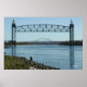 A fisherman on the shore of the Cape Cod Canal is framed by the ornate railroad bridge while the Sagamore Bridge is visible in the distance. The water reflected the railroad bridge in this photograph.