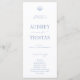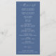 CAPE COD Coastal Blue, wedding program. Features, light blue typography and scallop seashell illustration on front with white typography and dusty navy-blue background backing.
