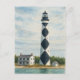 This stunning watercolor captures the distinctive beauty of the Cape Lookout Lighthouse, a true jewel of the North Carolina coast. Its iconic black and white diamond pattern stands boldly against a serene, cloud-streaked sky, a guiding light for mariners for generations. In the foreground, the tranquil blue-green waters reflect the light, inviting contemplation. Nestled on the sandy shore beside the towering beacon are the charming keeper's quarters, a historic white house with a welcoming porch, and a smaller outbuilding, all framed by a distant line of verdant trees. This piece perfectly embodies the remote charm and enduring spirit of Cape Lookout National Seashore.