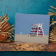 A lifeguard chair on the beach of Cape May with the lighthouse in the background.