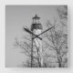 This is a black and white photo of the Cape May Lighthouse. Known to locals as Cape May Light, it is located in southern New Jersey in Cape May Point State Park. The lighthouse is at the very tip of South Jersey and serves as a beacon to incoming ships. This scenic photo was taken in winter, and the lighthouse can be seen through the bare branches of trees in the foreground. The lighthouse is a NJ landmark, a Cape May tourist attraction, and a beautiful piece of architecture.