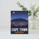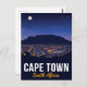 Experience the mesmerizing beauty of Cape Town, South Africa, at night with this captivating vintage-style postcard. The design features the iconic silhouette of Table Mountain overlooking the glittering city lights, all under a starry, full moon sky. This travel poster is perfect for lovers of South African destinations, stunning nightscapes, and natural landmarks. Ideal for sending greetings, keeping as a keepsake, or framing as dramatic wall art.
