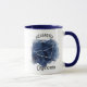 This coffee mug features an artistic representation of the Capricorn constellation set against a watercolor backdrop that mimics a starry night sky. The design incorporates shades of deep blue and white, suggesting the vastness and mystery of space. An optional name gently curves above the constellation and can easily be changed or removed by clicking "Personalise this template". The constellation itself is depicted by simple white lines connecting stars, which are represented by brighter white dots. Below the constellation, the word “Capricorn” is written in a clear, bold typeface, grounding the design with a touch of modernity.