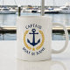 A Personalised giant 20-ounce coffee Mug with Captain rank or other title, your boat name, family name or other desired text. Featuring a custom designed nautical boat anchor, gold style laurel leaves and star emblem. Makes a great gift for any occasion.