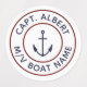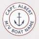 Personalised Captain with your name and boat name nautical anchor logo waterproof labels. White circle emblem with navy blue anchor and text with maroon boarders.
