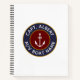 Personalised captain with your name and boat name nautical anchor logo spiral notebook. Navy blue and maroon classic circle emblem with white anchor. text and gold boarders on a white background.