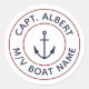 Personalised captain with your name and boat name nautical anchor logo round stickers. Classic round emblem with navy blue anchor. text and maroon boarders on a white background.