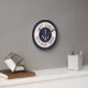 Personalised captain anchor logo round wall clock with your name and boat name. Classic circle emblem with anchor and text fields in navy blue, white and gold.