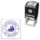 Captain with your name schooner sailboat logo self inking stamp. Classic round emblem with your name and boat name fields in block text and with schooner sailboat at centre.