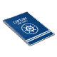 Captain's Log nautical notebook with custom name. Personalised office supplies with maritime theme. Add your own name or monogram. Vintage typography template with ship wheel and rope logo. Navy blue and white or custom background colour. Cool gift idea for sailor, skipper, fisher, boat captain, sailing friend, dad, father, uncle, grandpa, wife etc. Create your own log book, diary, journal, note book, agenda etc. Sailing and boating themed gifts for him and her. Handy for writing down memories and more.