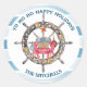 Coastal Christmas style, nautical themed holiday envelope seals featuring original artwork of a rustic captain's wheel with sea glass ornaments and string lights, and a cute, red crab holding a driftwood sign that says "Merry Christmas".  Accented by hand painted, weathered, blue and white stripes, with a "Yo Ho Ho Happy Holidays" festive greeting.  Easily personalise the greeting and name, just click on the "personalise" button and replace the sample text with your own.