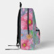 Step into a world of vibrant colours and intricate designs with this customisable printed backpack. The backpack is a canvas of soft pastel hues, meticulously adorned with a mesmerising floral print that promises to make every journey a picturesque affair. The print features a symphony of vibrant blossoms including large pink poppies and smaller purple daisies, each petal and leaf outlined with delicate strokes that breathe life into this wearable masterpiece. The flowers are set against a soft pastel blue background which makes the colours pop, creating a visually stunning contrast. Adding to the design are green leaves interspersed among the flowers, enhancing the natural aesthetic of the backpack.