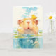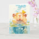 This delightful capybara greeting card features a cute capybara floating in water with a cheerful yellow bird perched on its head. Surrounded by lily pads and gentle water ripples, the capybara's content expression adds a charming touch to the scene. Rendered in a soft watercolor style, this card is ideal for nature lovers and those who appreciate whimsical animal art. Perfect for any occasion, this card celebrates friendship and tranquillity, making it a unique and heartwarming gift for capybara fans and animal lovers alike.
