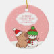 Spread holiday cheer with our Capybara and Snowman Ceramic Ornament. This cute ornament features a capybara in a Santa hat and a snowman in a winter costume, set against a white and pink snow background. Personalise it with a name to create a thoughtful gift for loved ones. Perfect for adding a festive touch to any Christmas tree.