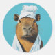 A charming and whimsical portrait of a capybara, the world’s largest rodent, dressed in a spa-like attire. The animal is draped in a white towel with another wrapped around its head, set against a soothing blue background. The capybara’s calm and serene expression gives the impression that it’s enjoying a moment of relaxation, adding a touch of humour and warmth to the scene. The detailed brushwork highlights the capybara’s fur and the soft texture of the towels, making this artwork a delightful and lighthearted piece.