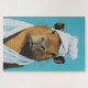 A charming and whimsical portrait of a capybara, the world’s largest rodent, dressed in a spa-like attire. The animal is draped in a white towel with another wrapped around its head, set against a soothing blue background. The capybara’s calm and serene expression gives the impression that it’s enjoying a moment of relaxation, adding a touch of humour and warmth to the scene. The detailed brushwork highlights the capybara’s fur and the soft texture of the towels, making this artwork a delightful and lighthearted piece.