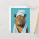 A charming and whimsical portrait of a capybara, the world’s largest rodent, dressed in a spa-like attire. The animal is draped in a white towel with another wrapped around its head, set against a soothing blue background. The capybara’s calm and serene expression gives the impression that it’s enjoying a moment of relaxation, adding a touch of humour and warmth to the scene. The detailed brushwork highlights the capybara’s fur and the soft texture of the towels, making this artwork a delightful and lighthearted piece.