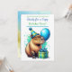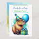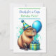 Blue and Green capybara themed boy's Birthday Party Invitations. A watercolor capybara holding a balloon and birthday gift. Cute for kids of any age!
