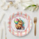 Adorable personalised capybara themed birthday party paper plates. A sweet watercolor capybara holding a balloon and birthday gift in pink and blue.