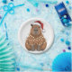 Chill capybara wearing a mini Santa hat, floating in a "hot spring" (mug of cocoa). Tiny ducks on its back also wear hats.