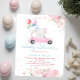 Unique drive-by girl baby shower invitation featuring watercolor pink vintage car with balloons, and flowers.
