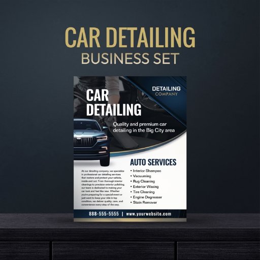 Promote your car detailing business with this sleek and professional invoice receipt order form template, designed in a bold navy blue and silver colour scheme. Ideal for any auto detailing company, this fully editable flyer allows you to customise every aspect to fit your brand — from the business name and contact information to a customisable list of services required. It allows you to bill your customer for car detailing services like vacuuming, interior shampooing, waxing, and more. Clean, modern, and impactful, this invoice is the perfect tool to show how professional you are, even after the job is done.