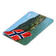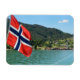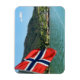 Rectangular souvenir photo magnet with the Norwegian flag on a car ferry between Solvorn and Urnes on a fjord in Norway.