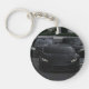 A round, decorative keychain featuring a photograph of three black luxury sports cars.