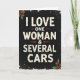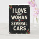 The Christmas greeting card showcases a whimsical and cheeky design that is sure to bring a smile to anyone's face. The bold, vintage-style cracked white lettering stands out against the distressed black background, adding a touch of edginess to the card. The message, "I LOVE ONE WOMAN & SEVERAL CARS," is sure to resonate with car enthusiasts and those who appreciate a good laugh. Festive touches like holly and berries border the design, adding a touch of holiday cheer 🎅🏼🎄🎁. The font is playful and inviting, drawing the customer in to spread some holiday joy. Perfect for spreading laughter and cheer this holiday season, this Christmas card is a must-have for those with a great sense of humor.
