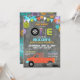 Mechanic theme with pick-up truck and tires and colourful bunting banner, tools, and gears and gears background print back design birthday invitation card.