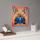 Features a fiery orange gradient background, a blue race car with flames coming off the tires, black and white chequered racing flags. Clock numbers are chequered flags and can be deleted if you wish. Perfect for any room in your home, office or lounge.. This design was created using original artwork© www.delightful-doodles.com