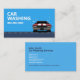 A business card for car washing activities. It features a vintage red car with white stripes down the middle and some bubbles, parked on a street with a blue background.
