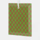 A checkered pattern alternating between green and brown squares. The colors create an earthy, symmetrical design with a balanced, even tone.