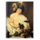 Caravaggio Bacchus notebook. Oil painting on canvas from 1595. Bacchus is one of Italian artist Caravaggio’s most famous paintings. The work features a young man dressed as the classical god Bacchus with leaves and grapes in his hair and a bowl of fruit sitting before him. The painting famously contains a wine carafe in which the image of the painter at his easel can be seen. The wine glass the young man holds likewise contains his reflection. A great gift for fans of Caravaggio, Baroque art, Mythology paintings, and wine.