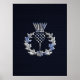 A silver chrome like Scottish thistle applique design on a racy navy blue carbon fibre style print background.