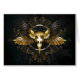 Artistically drawn, symmetrical, composition of black and gold, bird wings, golden, bird skull decorated with gilded pattern on dark, textured background.Gothic style