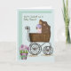 Pretty little baby girl with a big green bow on her head, sitting in a vintage pram with a pot of lavender tulips at the bottom left of the design. Fantastic card to send to someone to invite them to a baby shower. Thanks to KazKraft, Designs by Elena and the Hungryjpeg for some of the elements in the design