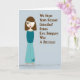 This is a light slate blue card with a cute lady in brown straight hair, a turquoise top and flared pants and is wearing a patch on her eye. Perfect card for the occasion.