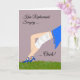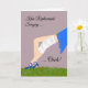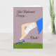 Card for knee replacement surgery with hand drawn legs, and a cast on the left knee. The legs in the image have a blue skirt, and blue heals. Her legs are on a patch of painted grass with little orange flowers.