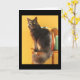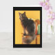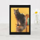 Black cat is sitting on table filled with cones of yarn, background is orange/tan with black border. Personalise greeting inside from "May your day be warm and cosy" - "Happy Birthday!" to your own text.