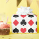This wrapping paper features a pattern of hearts, clubs, spades, and diamonds in red and black.