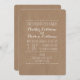 A wedding invitation featuring a brown paper cardboard inspired background and white text.