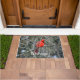 Bright red Northern Cardinal is a lively first impression on sturdy door mat.