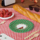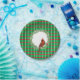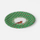 This design has a green background with red and white lines that form a pattern of squares. In the centre there's a white circle with an evergreen wreath and Cardinal.