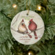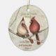A white Ceramic Christmas Ornament featuring a classic watercolor painting by A. E. West of a Cardinal pair.